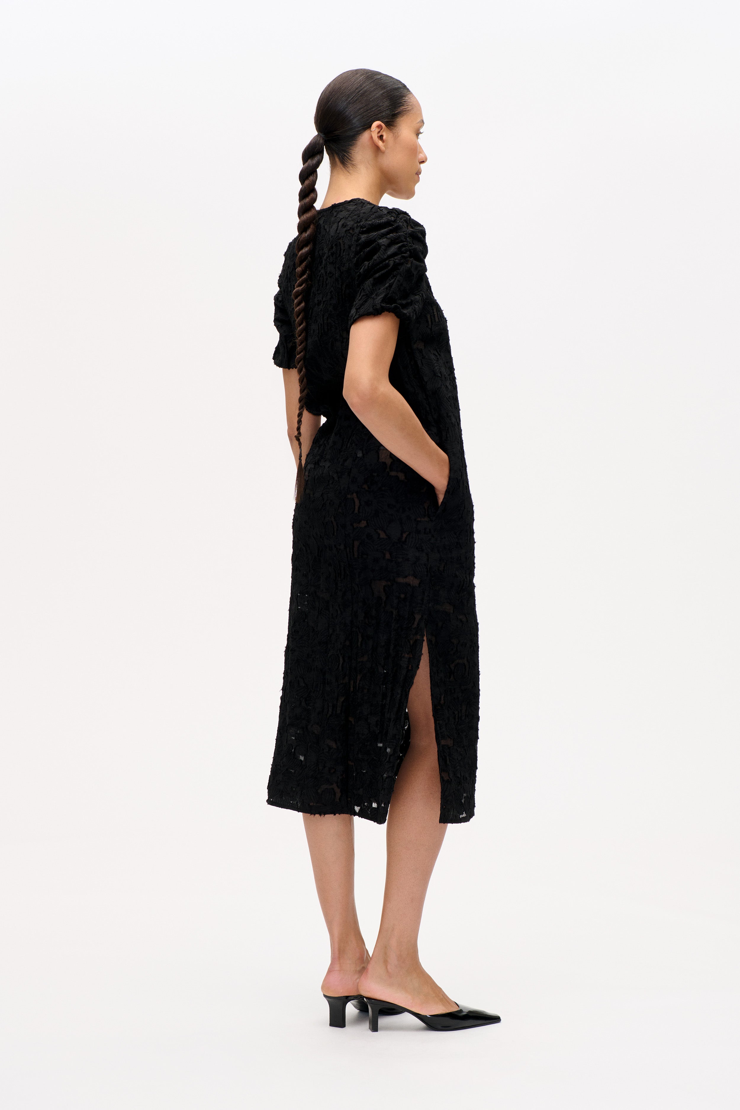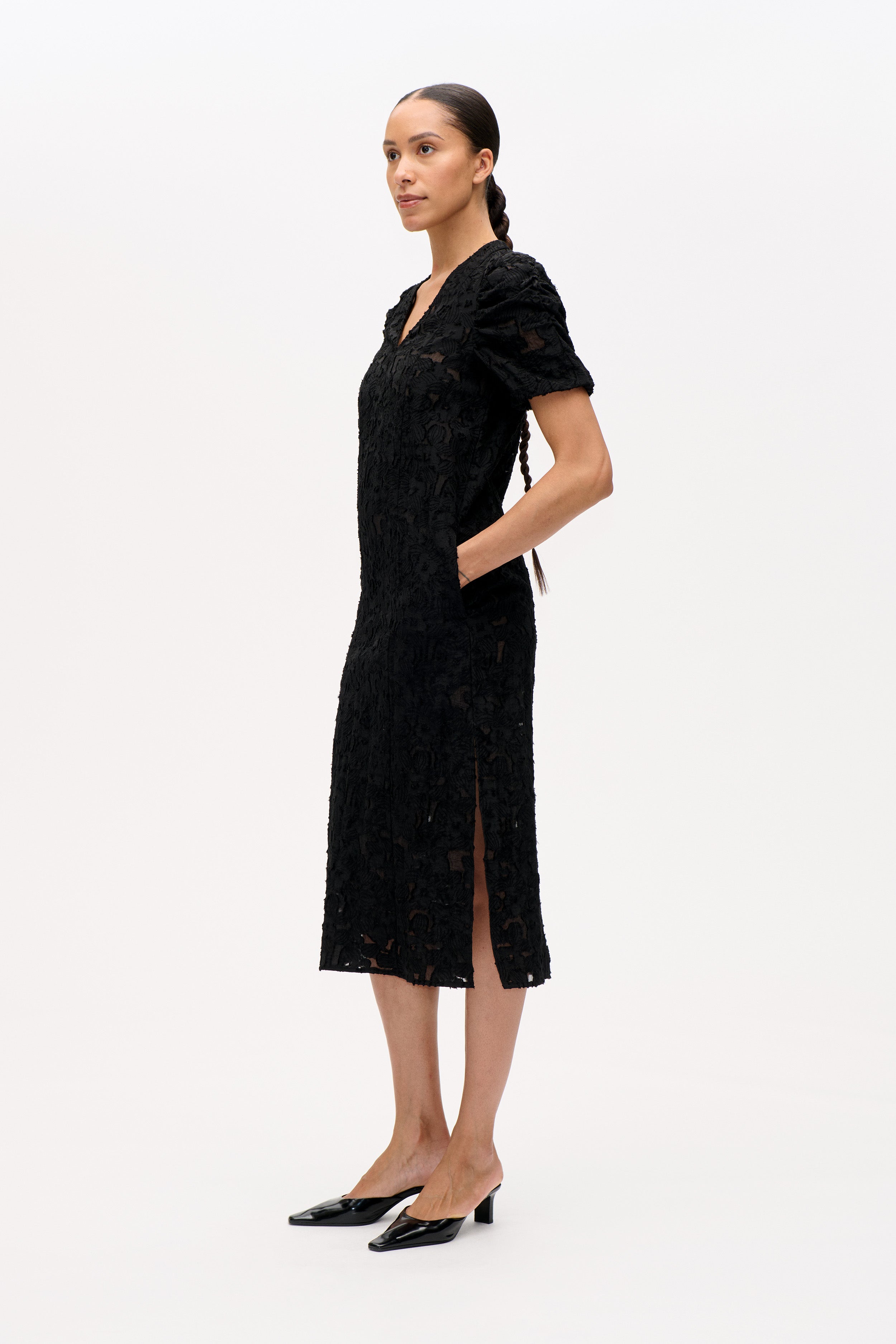 The Anina Dress is a stunning, semi-sheer midi dress crafted from delicate floral lace, perfect for adding a touch of romance to your wardrobe. Featuring a V-neckline and voluminous sleeves, this dress balances elegance and ease beautifully. Its loose fit and A-line silhouette create a graceful, flowing look. Ideal for special occasions or a chic daytime ensemble, the Anina Dress offers timeless style with a contemporary edge.