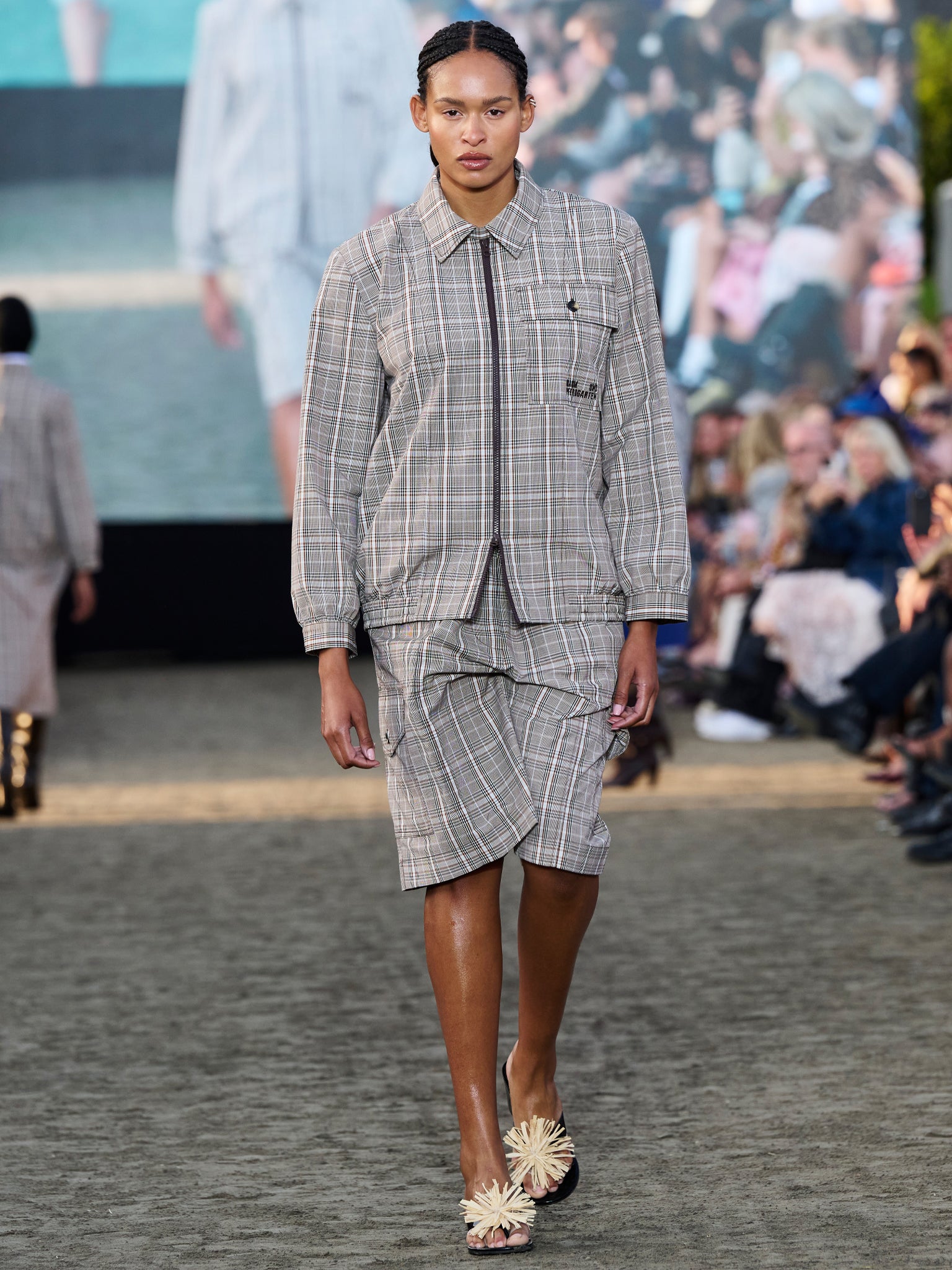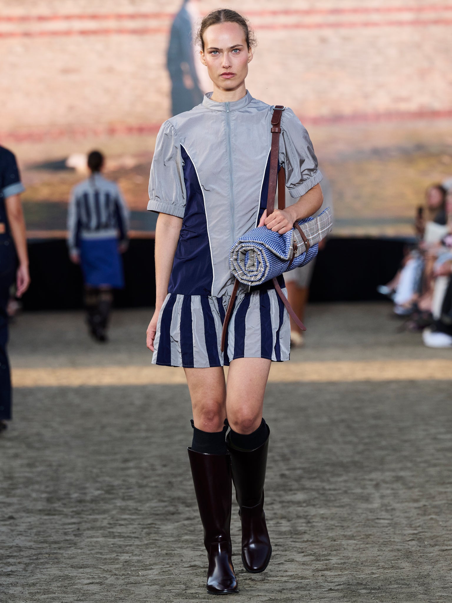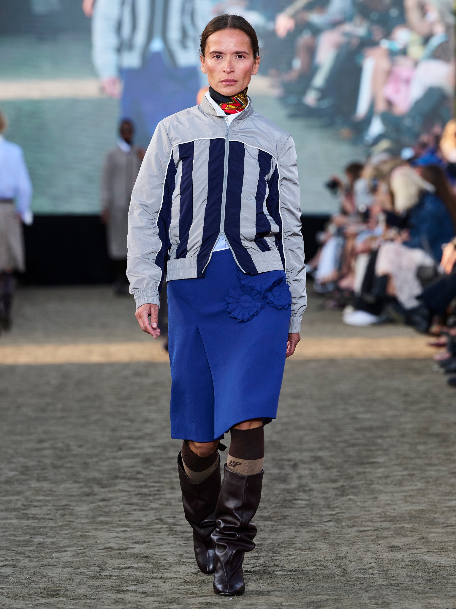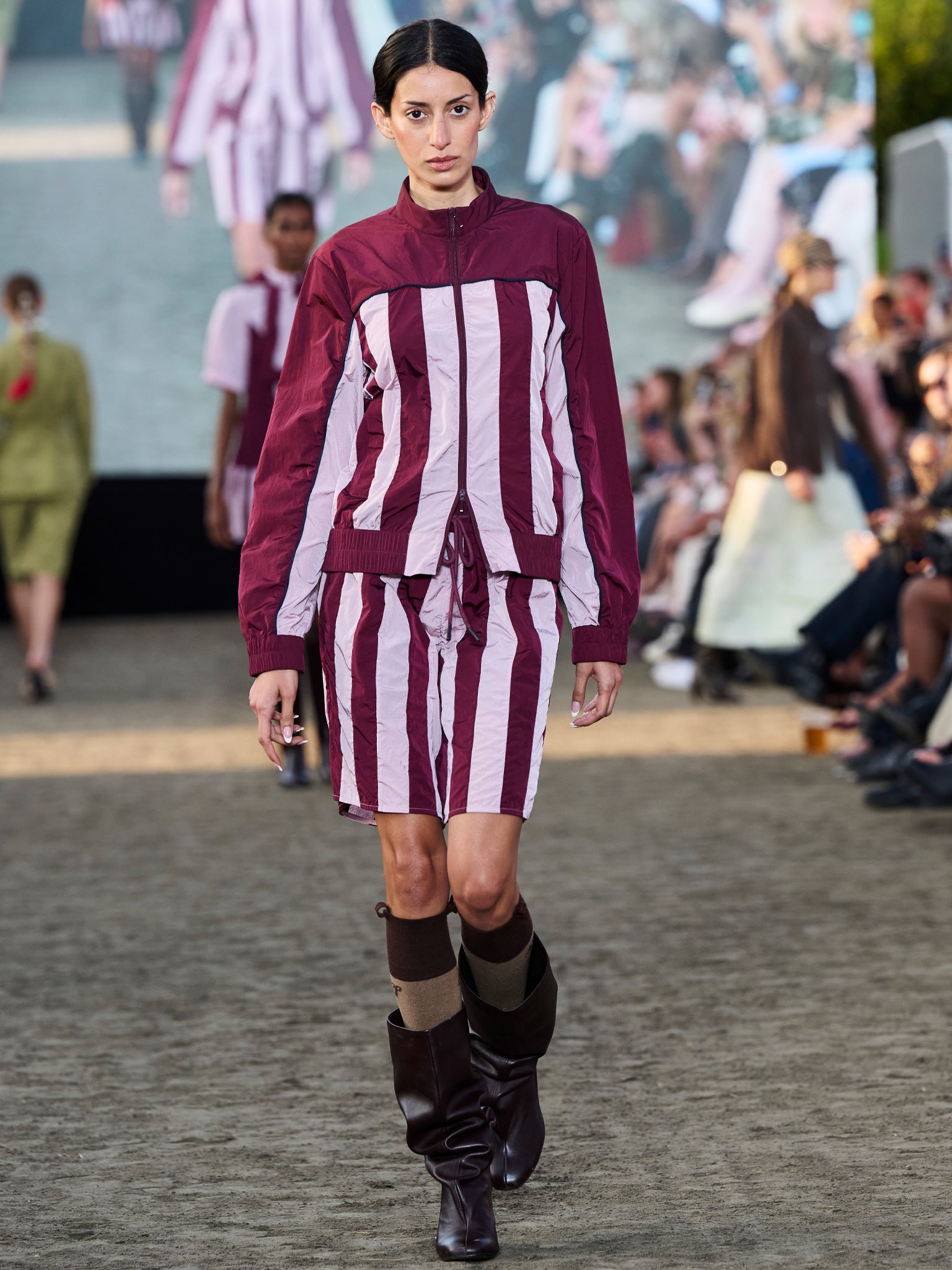 Striped nylon nods to the uniforms of jockeys, while checks and bold colour contrasts add a feeling of movement. Frilled details on sporty outerwear introduce a feminine tension, subtly referencing classic equestrian attire.
