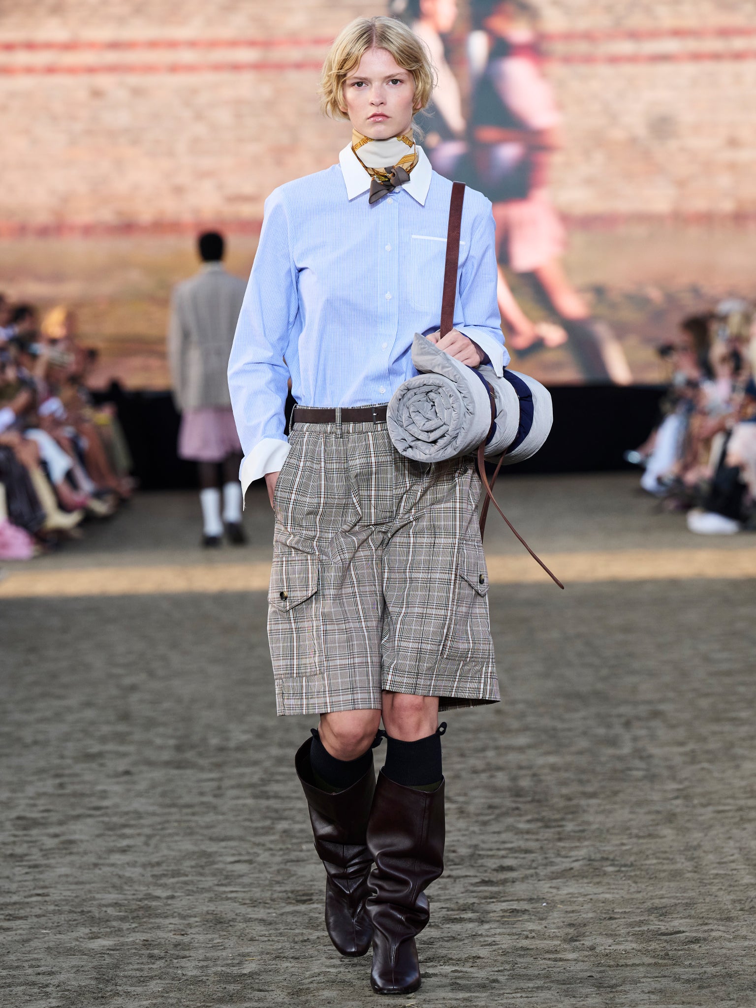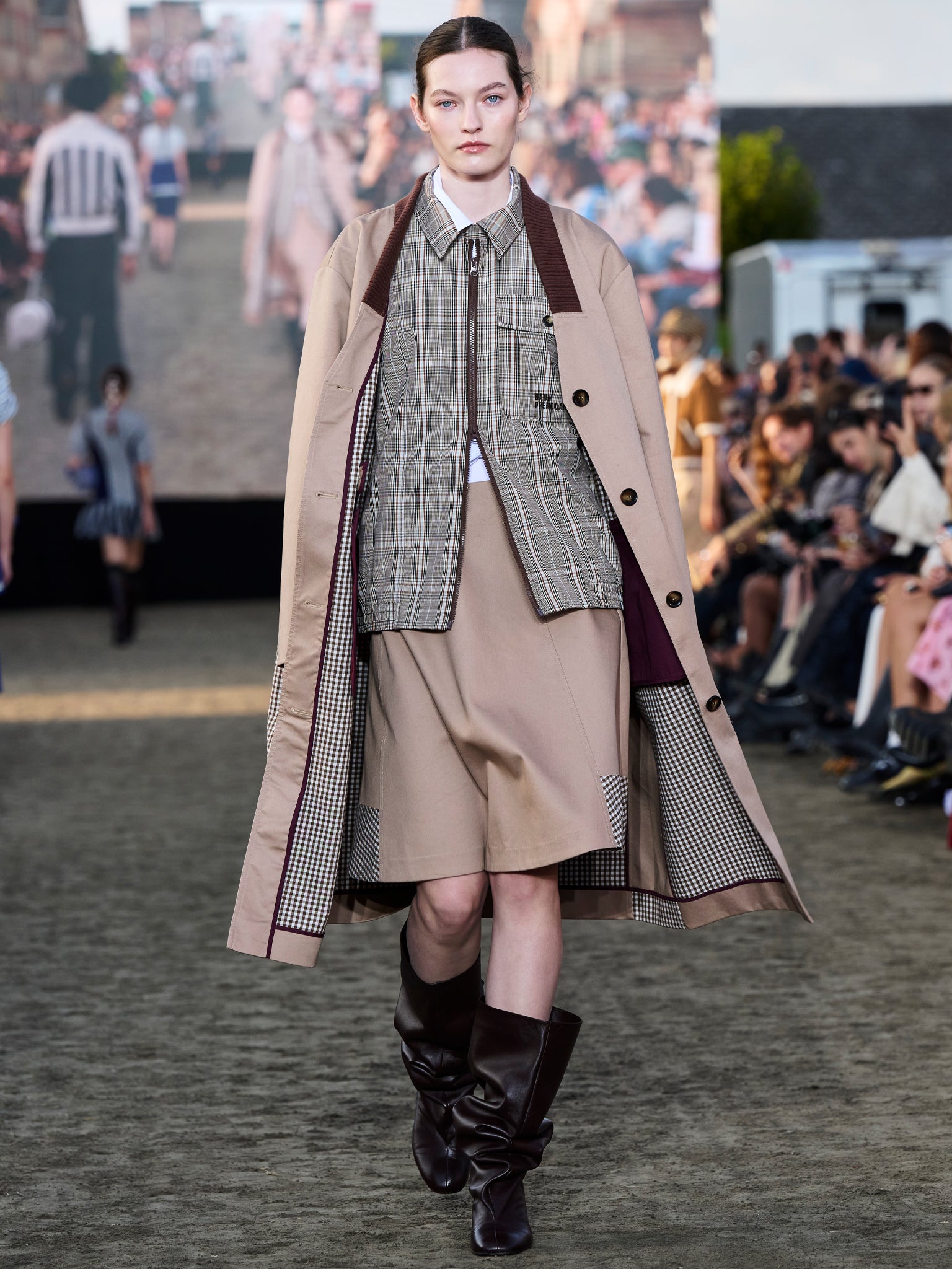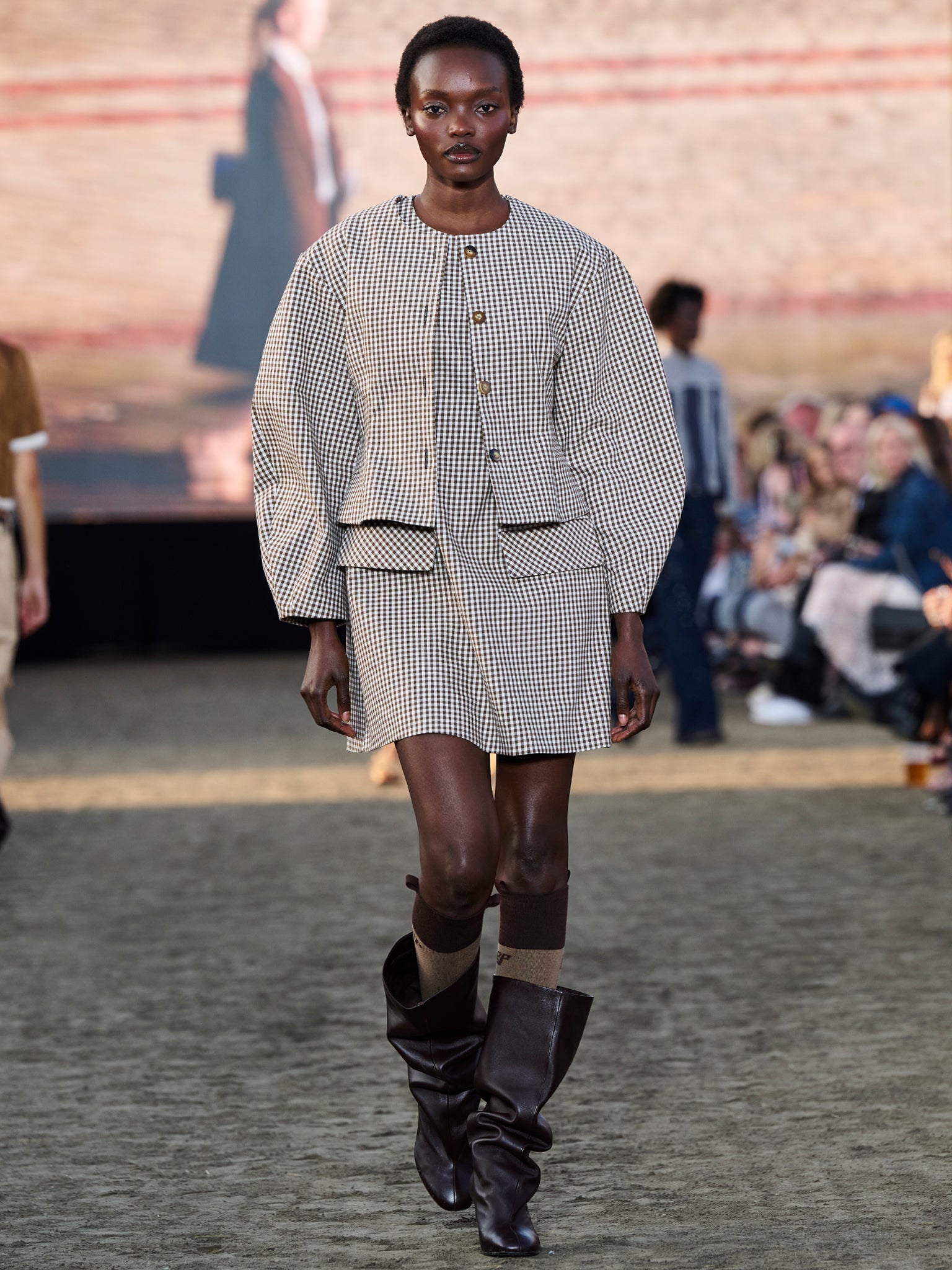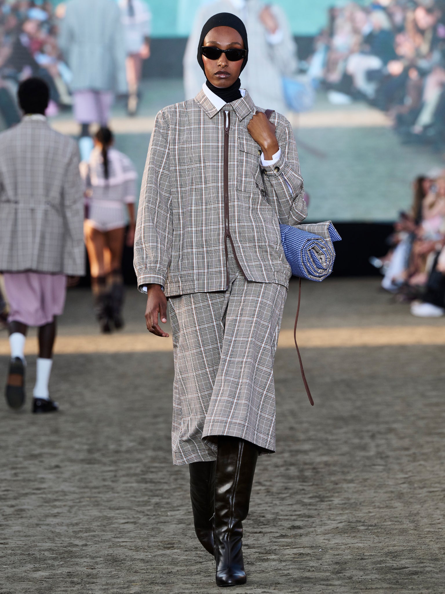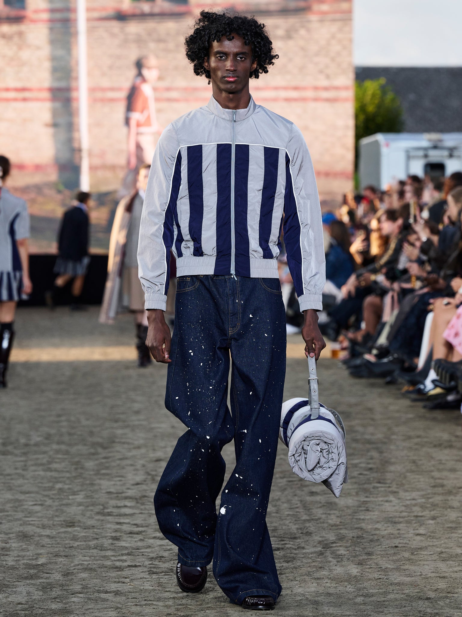 Striped nylon nods to the uniforms of jockeys, while checks and bold colour contrasts add a feeling of movement. Frilled details on sporty outerwear introduce a feminine tension, subtly referencing classic equestrian attire.