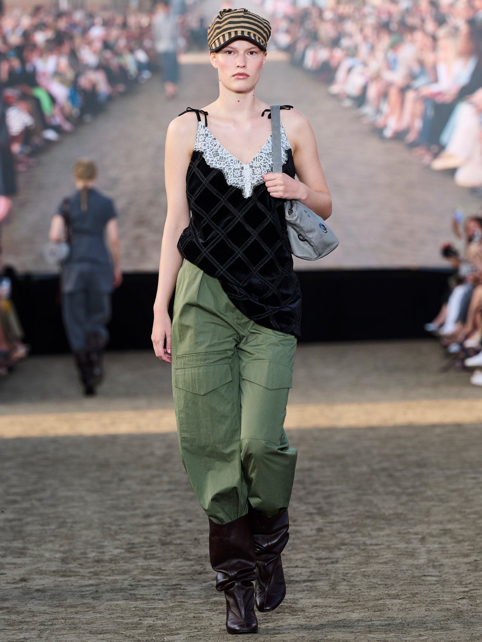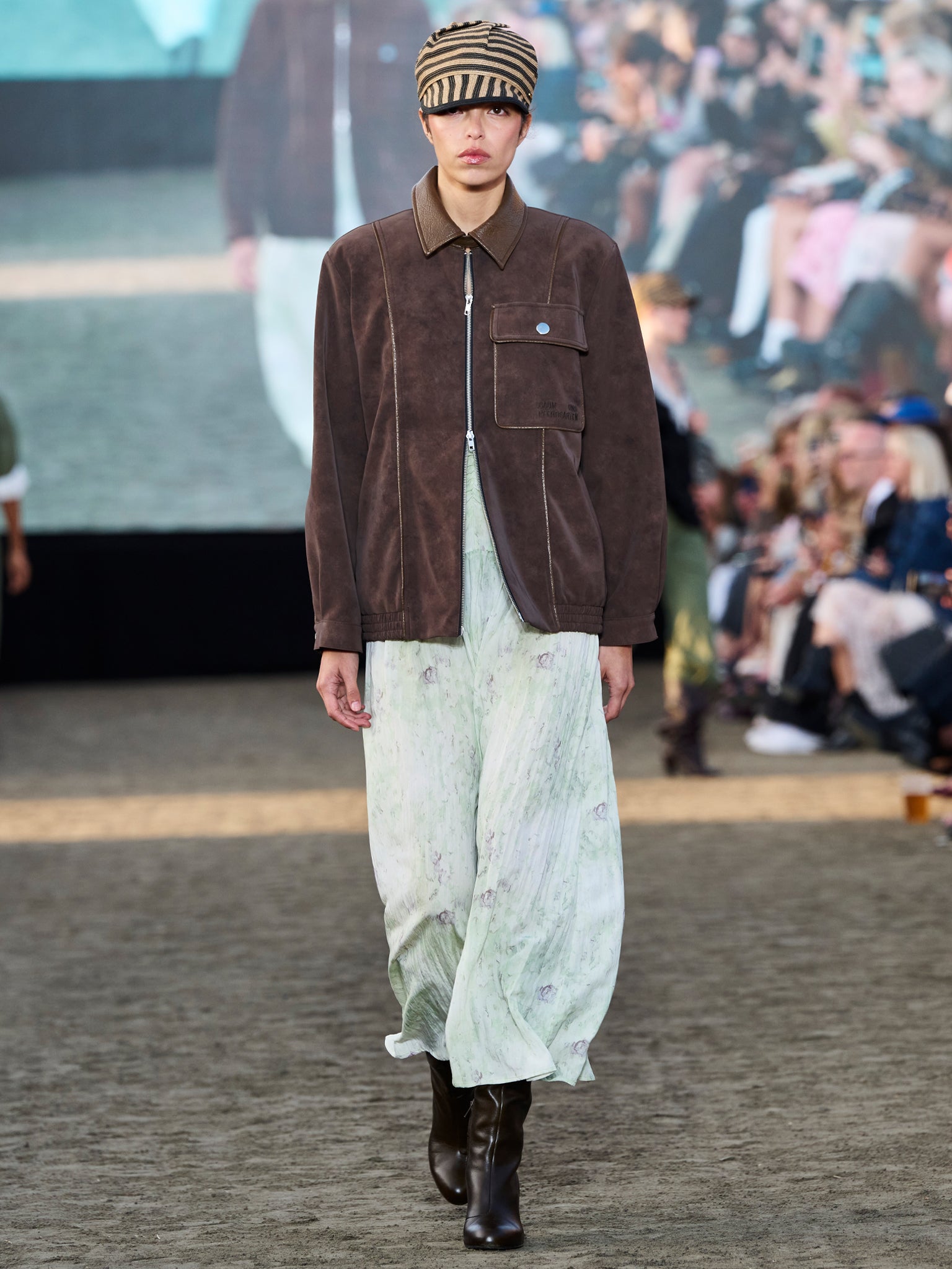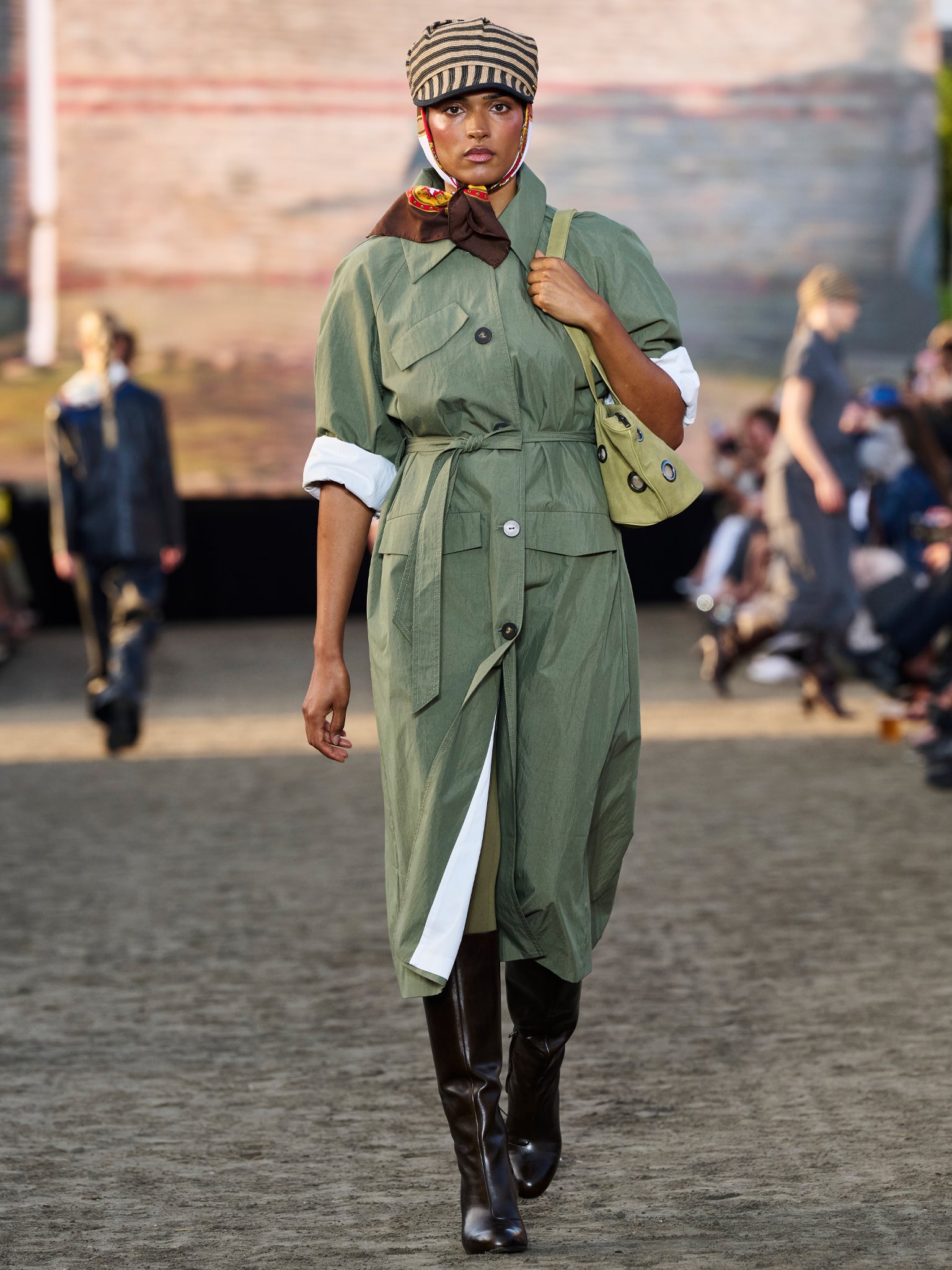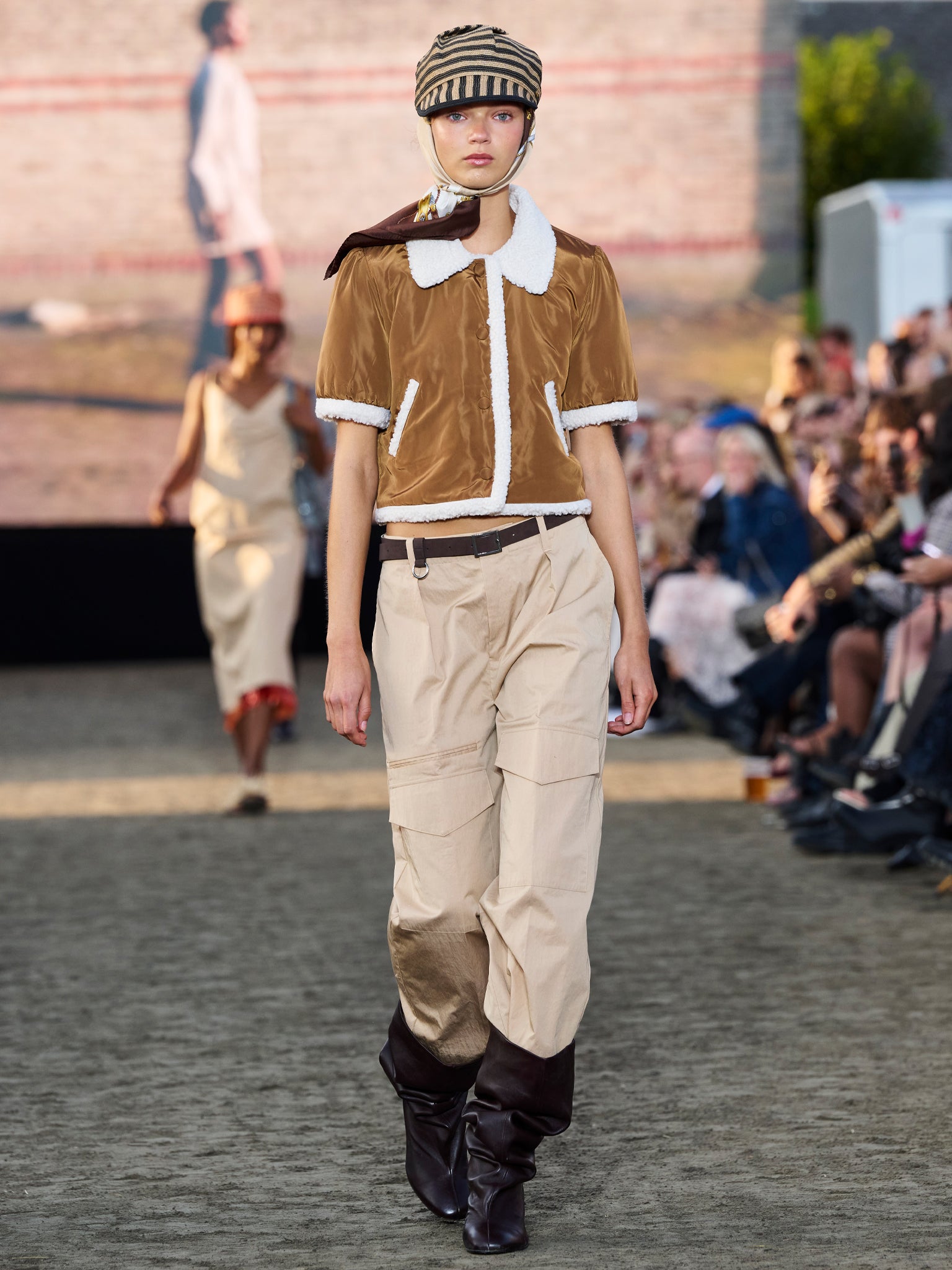 Striped nylon nods to the uniforms of jockeys, while checks and bold colour contrasts add a feeling of movement. Frilled details on sporty outerwear introduce a feminine tension, subtly referencing classic equestrian attire.