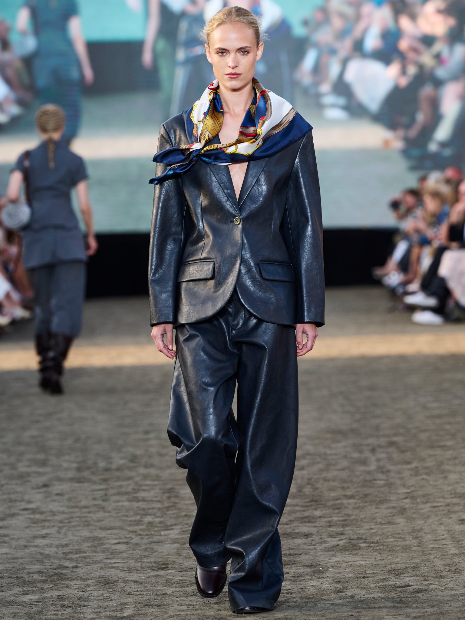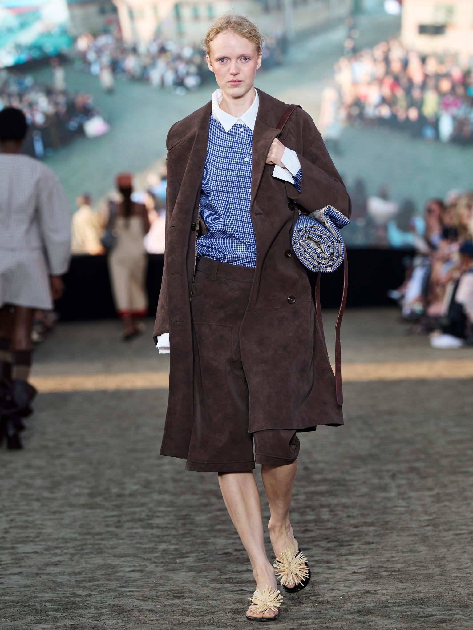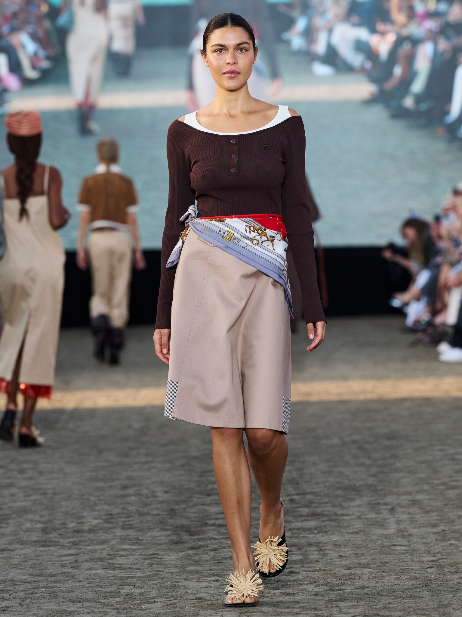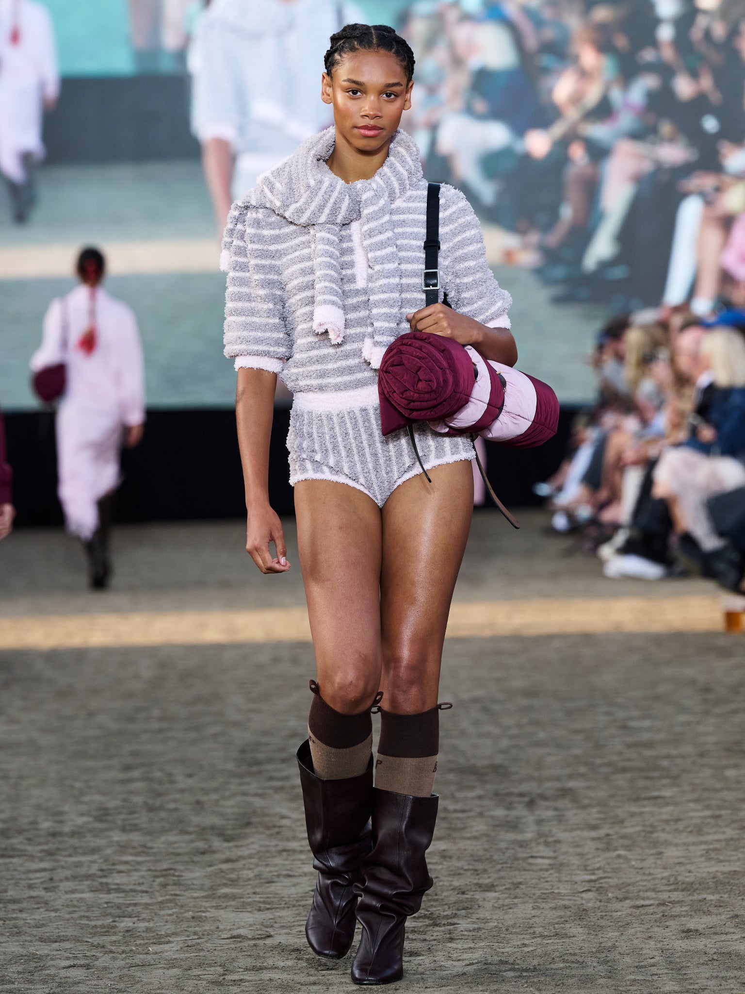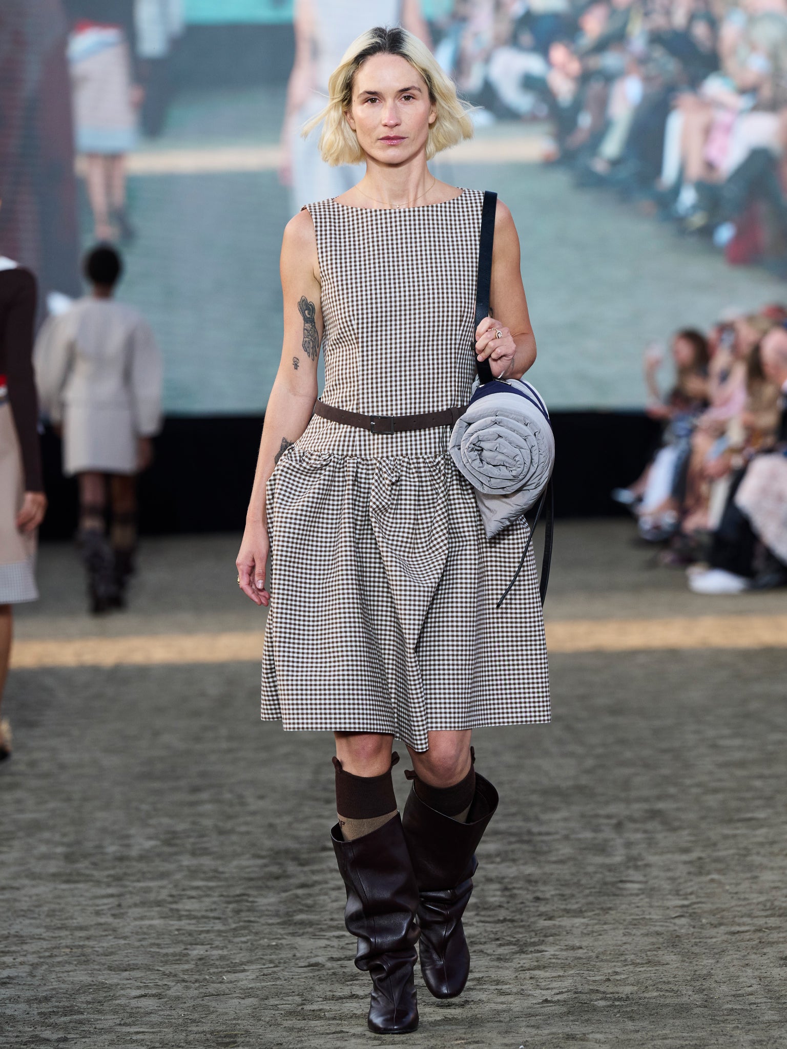 Striped nylon nods to the uniforms of jockeys, while checks and bold colour contrasts add a feeling of movement. Frilled details on sporty outerwear introduce a feminine tension, subtly referencing classic equestrian attire.