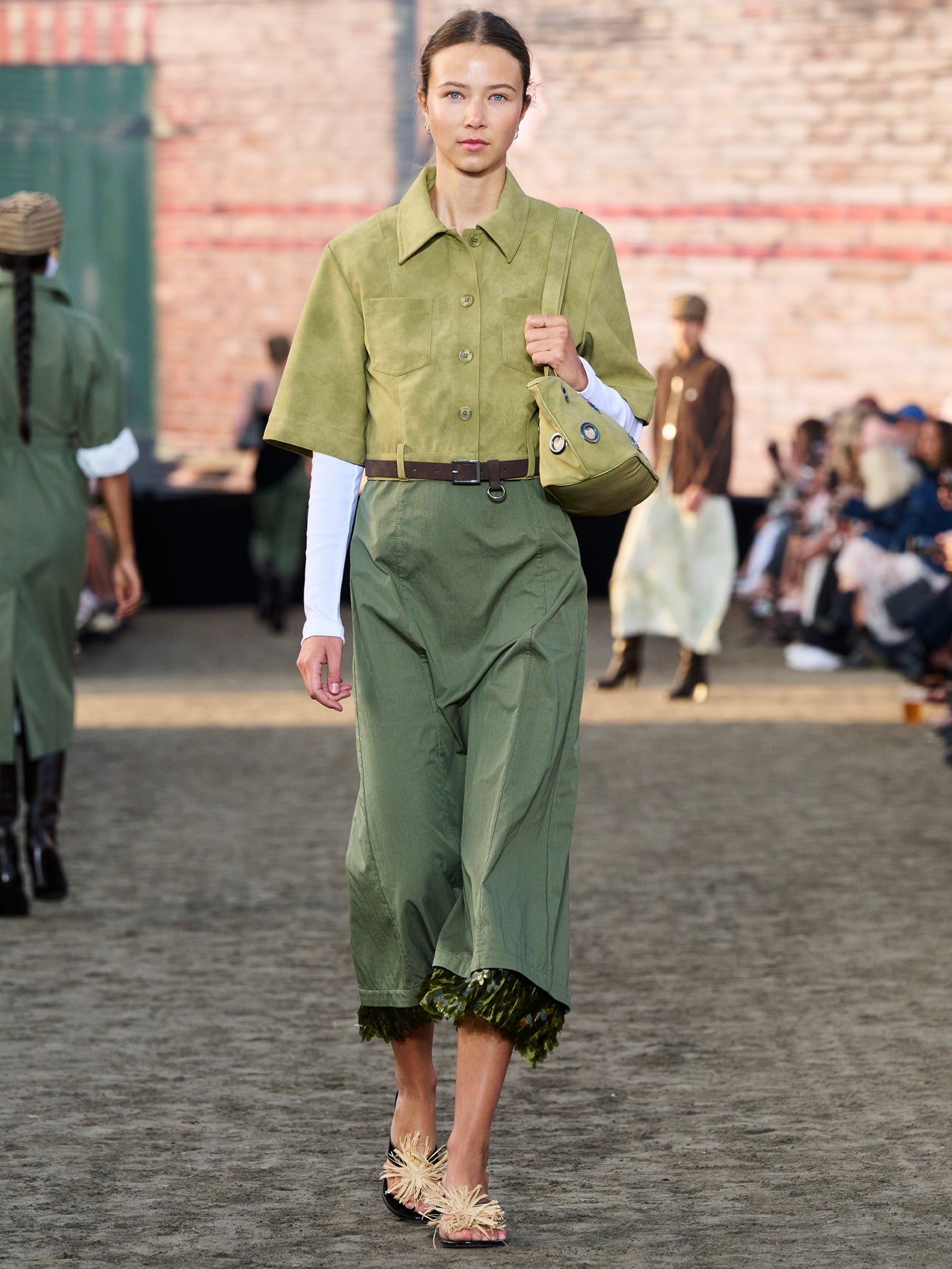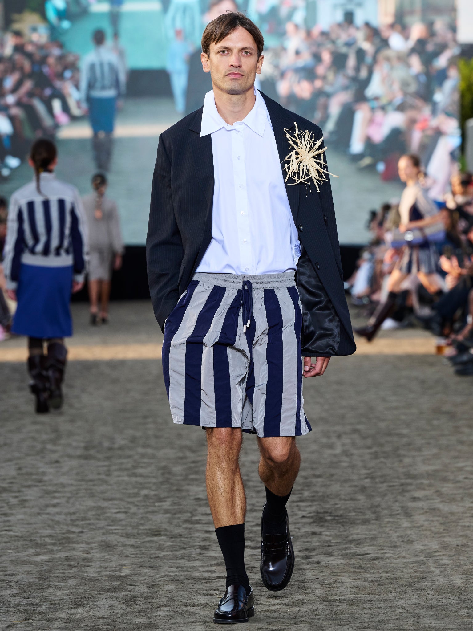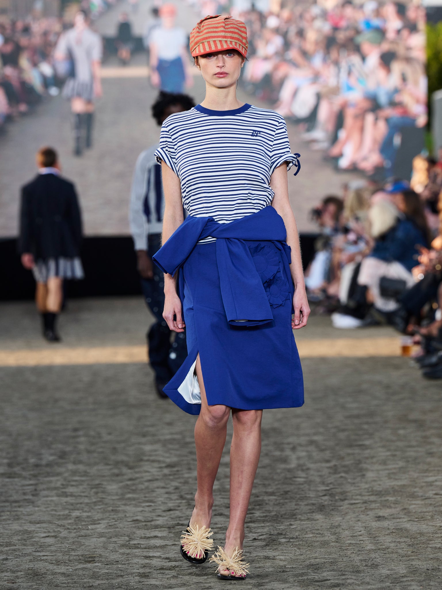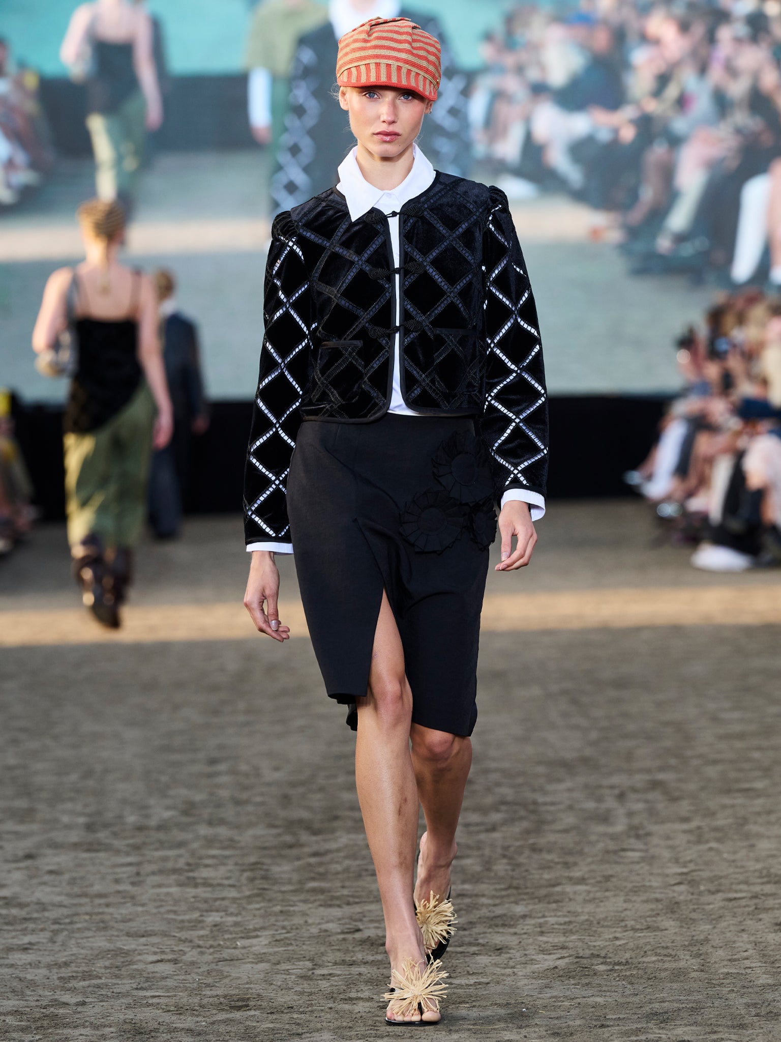 Striped nylon nods to the uniforms of jockeys, while checks and bold colour contrasts add a feeling of movement. Frilled details on sporty outerwear introduce a feminine tension, subtly referencing classic equestrian attire.