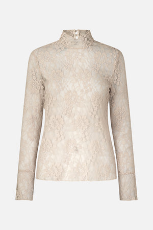 Elegancia con un toque de encanto La blusa Meena es una elegante prenda transparente confeccionada en el más bello encaje floral. La blusa de manga larga es ligeramente entallada y tiene cierre de botones con abertura en forma de ojo de cerradura en la espalda para una silueta femenina. El cuello alto y las mangas ligeramente acampanadas con botones añaden un encanto extra al estilo. Combínala con pantalones y un top o sujetador debajo para un look desenfadado. Ceñido Cuello alto Mangas ligeramente acampanadas Botones en las muñecas Cierre con botones