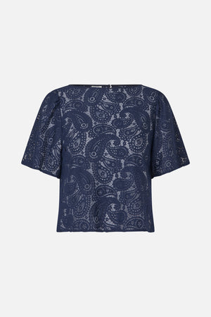 Parfait pour compléter votre garde-robe de tous les jours, le haut Mera est un modèle intemporel et classique, rehaussé d'une magnifique dentelle à motif cachemire pour une touche d'élégance. Ce haut à manches courtes est transparent, mais il intègre un élément intérieur permettant plus de couvrance. Il présente une encolure bateau flatteuse et s'associe facilement à un jean et des chaussures plates pour un look chic au quotidien. Coupe décontractée Encolure bateau Fermeture boutonnée dans le do