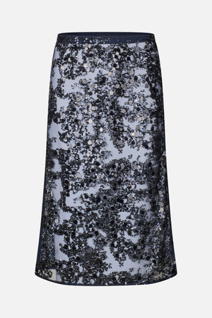 The Shania Skirt embraces the sparkle with its eye-catching sequins design. The skirt has a high waist and midi length for an elegant yet modern silhouette. It has a mesh lining underneath the sheer sequins layer for some extra coverage. The elasticated waistband ensures a comfortable fit that can be worn high or low-waisted to suit your style. When it comes to sparkle, there are no rules. Style it however you like - Go all out in our matching sequins styles or dress it down with one of our t-shirts, shirts or knitwear.
